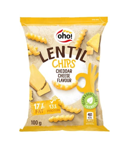 Křehké čočkové chipsy s jemnou chutí sýra čedar. Obsahují 13 g rostlinných bílkovin na 100 g, jsou zdrojem vlákniny, s nízkým obsahem nasycených tuků a bez palmového oleje. Každá porce má méně než 99 kcal – skvělá volba pro lehké a chutné zobání kdykoli během dne.