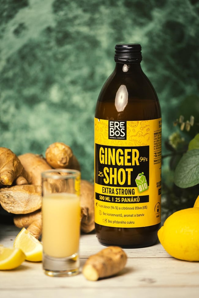 Erebos Ginger Shot 94 % je nejkoncentrovanější zázvorový shot na trhu – obsahuje 94 % BIO zázvorové šťávy z peruánského zázvoru a 6 % BIO citronové šťávy. Bez vody, bez cukru, bez kompromisů. Díky extrémní intenzitě nabízí široké využití – můžete ho dát jako panáka, přidat do horké vody jako čaj, nebo ho použít jako ostrou složku do míchaných nápojů či smoothie.