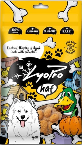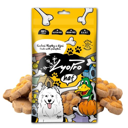 Voňavé kachní tlapky s dýní sušené mrazem si zachovávají přirozenou chuť, aroma i výživové hodnoty. Zdravá a chutná odměna, kterou si váš pes zamiluje.