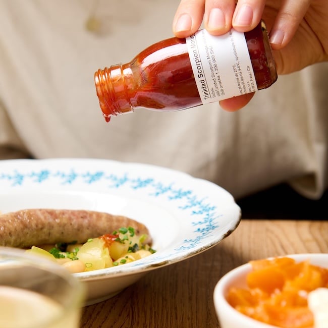 Koncentrovaná pálivá omáčka z fermentovaných chilli papriček Trinidad Scorpion Moruga Red, které se pěstují na české Sluneční farmě Vykáň. Omáčka je ručně vyráběná v pekárně Eska a vyniká hloubkou chuti a vyváženou pálivostí.