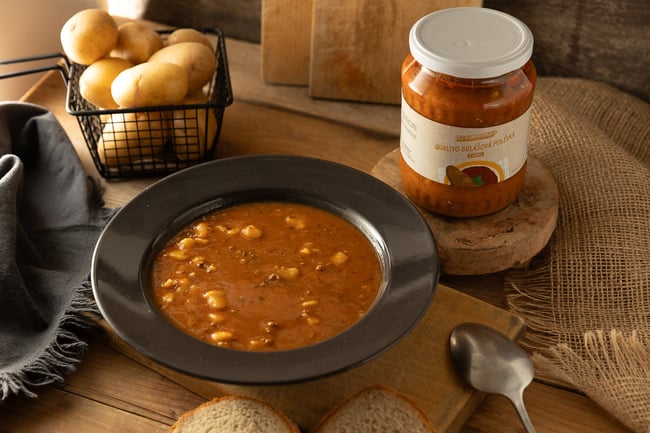 Gulášová polévka od značky Qualivo v prémiové kvalitě. Polévka je vyrobena z vývaru, hovězího mletého masa, čerstvé zeleniny a koření.