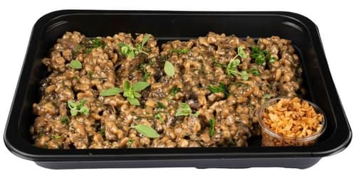 Hotové krupoto od Cibule Bistro. Je připraveno z ječných krup a směsi hub.