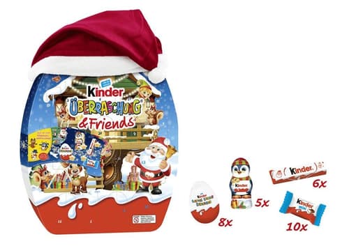 Kinder Surprise: mléčná čokoláda 47 % (cukr, sušené plnotučné mléko, kakaové máslo, kakaová hmota, emulgátor: sojové lecitiny, vanilin), sušené odtučněné mléko (17 %), cukr, rostlinné tuky (palmový, bambucké), emulgátor: sojové lecitiny, vanilin.