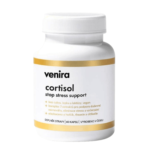Doplněk stravy. Venira Cortisol stop stress support ve formě kapslí obsahuje 10 aktivních látek, v popředí s extra silným výtažkem z kořene ashwagandhy, L-theaninem ze zeleného čaje, hořčíkem i citikolinem. Produkt je vhodný pro osoby vystavené dlouhodobé zátěži, aktivní sportovce i pro studenty ve zkouškovém období a lidi s vysokým mentálním nasazením. Kapsle jsou přírodní a vhodné pro vegany, neobsahují lepek ani laktózu. Balení obsahuje kúru na 30 dní. Nepřekračujte doporučené denní dávkování. Uchovávejte mimo dosah dětí. Doplňky stravy nejsou náhradou pestré a vyvážené stravy. Balení obsahuje 60 kapslí. Hmotnost obsahu: 42 g.