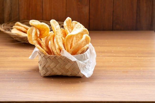 Křupavé krevetové krekry jsou tenké chipsy, které spojují pikantní chuť chilli s kyselostí limetky a jemnou mořskou příchutí krevet. Vyrobeny jsou z tapiokové mouky a krevetového prášku a dochuceny solí, chilli a limetkovou šťávou. Lehká a křupavá textura je ideální pro rychlou svačinu nebo jako doplněk k různým pokrmům.