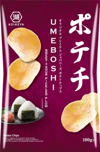 Bramborové chipsy s příchutí nakládaných švestek. Nakládané švestky patří mezi tradiční japonské potraviny. Jejich chuť je dobře vyvážená mezi sladkostí a kyselostí. Vychutnejte si autentické japonské chutě.