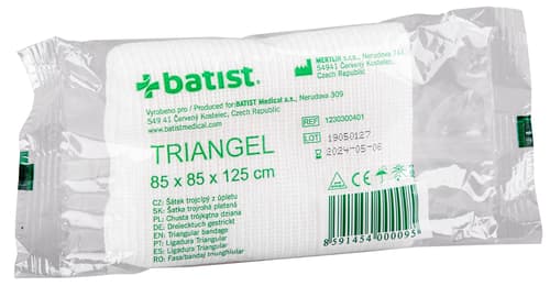 Zdravotnický prostředek. Trojcípý šátek BATIST je vyroben z úpletu viskózové střiže zajišťující pevnost a prodyšnost při nošení. Je jednotlivě zabalený do rychlouzavíratelného sáčku a okamžitě použitelný v předlékařské pomoci i ambulantní péči. Šátek trojcípý je vhodný pro fixaci končetin, především paží a hlavy při zhmožděninách a zlomeninách. Vlastnosti produktu: Rozměr: 85 x 85 x 125 cm. Šátek trojcípý z úpletu viskózové střiže. Jednotlivě balený. Balení obsahuje 1 ks.