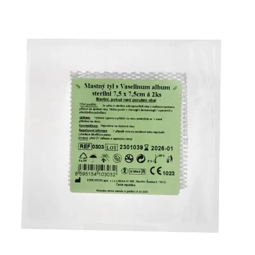 Zdravotnický prostředek. Krytí sterilní - mastný tyl se používá u pacientů s kožní a lékovou přecitlivělostí, v chirurgické praxi k ošetření povrchových popálenin, odřenin, kožních defektů. Je vyroben z obvazové textilie S20, což je vysoce porézní hydrofobní obvaz z chemických vláken vhodný pro impregnaci léčiv v tekutém nebo masťovém základu. Obsahuje látku Vaselinum album, která je farmaceutickou pomocnou látkou. Je bílá, průsvitná a roztíratelná, bez zápachu a neobsahuje aktivní látky. Sterilizace probíhá gama zářením a výrobek je certifikován značkou CE. Rozměr 7,5 x 7,5 cm. Balení obsahuje 2 ks.