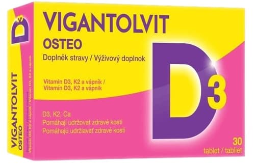 Doplněk stravy. Vigantolvit Osteo je doplněk stravy ve formě tablet. Tento produkt je speciálně formulován s ohledem na potřeby žen ve věku 50 let a starších. Vitamin K2 je obsažen ve formě MK-7, která představuje vysoce biologicky dostupnou formu této důležité látky. Kombinace těchto složek vytváří komplexní řešení pro každodenní výživu kostní soustavy. Vigantolvit Osteo poskytuje 3 základní látky pro normální stav kostí: Vitamin D3, K2 a vápník. Vitamín K2 je přítomen ve formě MK-7. Vitamin D3 a vápník také podporují normální svalovou funkci/přispívají k normální svalové činnosti. Nepřekračujte doporučené denní dávkování. Uchovávejte mimo dosah dětí. Doplňky stravy nejsou náhradou pestré a vyvážené stravy. Balení obsahuje 30 tablet. Hmotnost obsahu: 49 g.