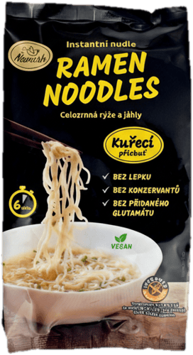 Instantní nudle Ňamish s kuřecí příchutí. Nudle jsou vyrobené z celozrnné rýže a jáhel. Jsou bez lepku a vhodné pro vegeteriány i vegany. Rychlá a chutná volba, když potřebujete teplé jídlo během pár minut.