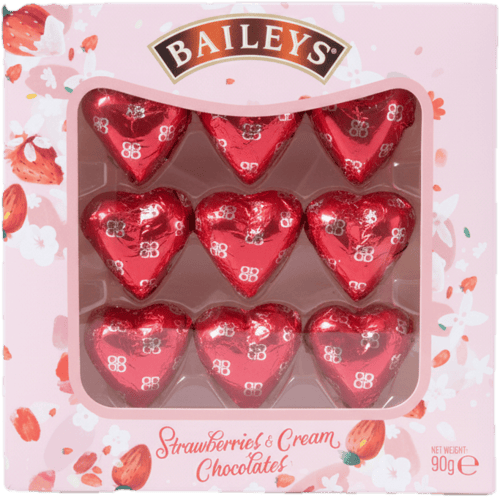 Česká republika,Pralinky z kvalitní mléčné čokolády ve tvaru srdce obsahují jemnou smetanovou náplň s jahodami a nádechem ikonického irského krému Baileys.