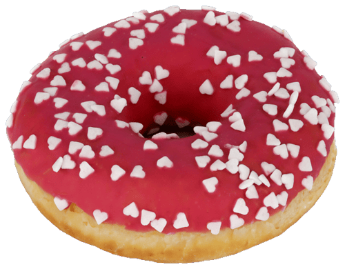 Sladký růžový donut, který je vyroben z jemného kynutého těsta. Na povrchu je přelitý růžovou polevou a posypán bílými cukrovými srdíčky.