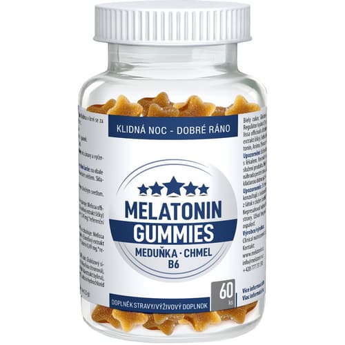 Doplněk stravy. Melatonin Gummies Meduňka + Chmel + B6 je doplněk stravy. Melatonin je látka tělu vlastní ovlivňující cirkadiální rytmy, jeho hladina v krvi se za normálních okolností zvyšuje po nástupu tmy a vrcholí uprostřed noci. Organismus si ji vytváří sám, jeho produkce s věkem může klesat. Meduňka lékařská přispívá k pozitivní náladě, podporuje relaxaci a spánek. Chmel otáčivý podporuje dobrý spánek a přináší uklidňující účinek. Vitamín B6 podporuje správnou činnost nervové soustavy a snižuje míru únavy a vyčerpání. Nepřekračujte doporučené denní dávkování. Uchovávejte mimo dosah dětí. Doplňky stravy nejsou náhradou pestré a vyvážené stravy. Balení obsahuje 60 pektinových bonbónů s lahodnou pomerančovou příchutí. Hmotnost obsahu 150 g.