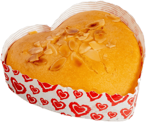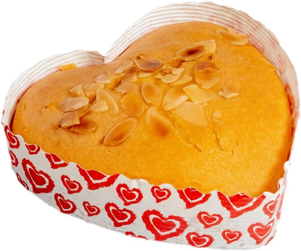 Sladká bezlepková buchta ve tvaru srdce. Na povrchu je posypána mandlovými lupínky. Jemné pečivo vhodné pro osoby s celiakií.