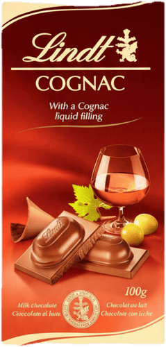 Mléčná tabulková čokoláda Lindt Cognac s koňakovou náplní je určena pro milovníky čokolády a exkluzivního alkoholu.
