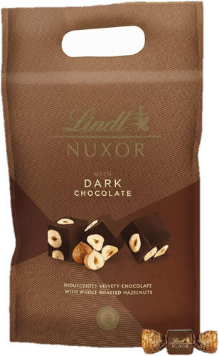 Lindt Nuxor oříšková hořká čokoláda nabízí kombinaci křupavých pražených lískových ořechů a jemné gianduja hořké čokolády.