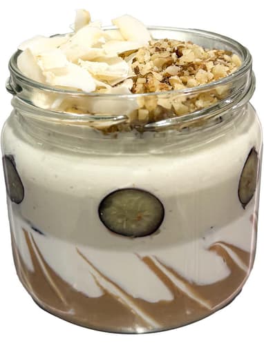 Jemný smetanový jogurt s borůvkami, karamelovým proteinem, vlašskými ořechy a kokosem. Tato kombinace přináší přirozenou sladkost a příjemnou křupavost, a to vše bez přidaného cukru.