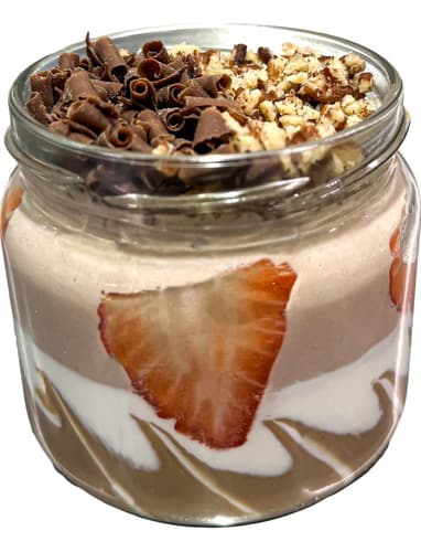 Hutný řecký jogurt s krémem z arašídů a mléčné čokolády tvoří základ tohoto dezertu. Čerstvé jahody, čokoprotein, pekany a čokohoblinky dodávají výraznou chuť a dezertní charakter. Jogurt obsahuje 44 g bílkovin v jedné skleničce a je ideální volbou pro sladkou odměnu.