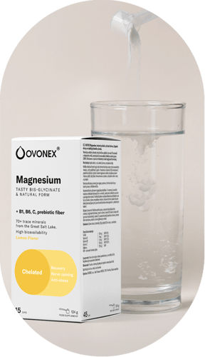 OVONEX Hořčík s osvěžující citrónovou příchutí je instantní doplněk stravy, který kombinuje vysoce vstřebatelný bisglycinát hořečnatý s přírodními minerály z Velkého Solného jezera a vitamíny B1, B6, C. Je šetrný k žaludku, pomáhá snižovat únavu, podporuje svaly, psychiku a imunitu. Ideální pro vegany, sportovce, těhotné i kojící ženy. Balení 124g.
