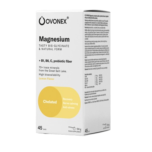 Doplněk stravy. Ovonex Hořčík je doplněk stravy obsahující instantní hořčík s osvěžující citrónovou příchutí. Kombinuje vysoce vstřebatelný bisglycinát hořečnatý s přírodními minerály z Velkého Solného jezera, vitaminy B1, B6, C a prebiotickou vlákninu. Je šetrný, účinný a nezatěžuje trávení. Bisglycinát hořečnatý – tedy hořčík navázaný na 2 molekuly aminokyseliny glycin – napodobuje přirozené vstřebávání živin, takže šetří žaludek a tělo dokáže vstřebat a využít až 95 %. Bisglycinát hořečnatý se skvěle vstřebává, je šetrný k žaludku, nezatěžuje trávení a je vhodný i pro citlivější jedince. Minerály pocházejí z Velkého Solného jezera v Utahu (USA), jednoho z nejčistších přírodních zdrojů minerálů na světě. Jezero je slanější než moře a díky přísunu materiálu z okolních hor v něm každoročně přibývají miliony tun minerálů. Během 2letého solárního koncentračního procesu vzniká vysoce koncentrovaný roztok minerálů obsahující více než 70 minerálů a stopových prvků v přirozené iontové formě, která je velmi dobře vstřebatelná. OVONEX následně přidává chelátové formy minerálů a vhodné vitaminy, aby se ještě zvýšila využitelnost v těle. Každá várka koncentrátu prochází testováním na obsah minerálů a těžkých kovů pro zajištění maximální bezpečnosti. 100% přírodní minerální koncentrát je základem celé minerální řady OVONEX. Hořčík pomáhá s energií, přispívá ke snížení únavy a vyčerpání, podporuje normální činnost svalů, psychiku a normální činnost nervové soustavy, přispívá k normálnímu stavu kostí a zubů a napomáhá k udržení správné hladiny iontů. Vitamín B1 a B6 přispívají ke správnému energetickému metabolismu, činnosti nervové soustavy a psychické činnosti, zatímco vitamin C podporuje imunitu. Tento dpolněk stravy je vhodný pro vegany, sportovce, těhotné a kojící ženy a všechny osoby s deficitem hořčíku. Nepřekračujte doporučené denní dávkování. Uchovávejte mimo dosah dětí. Doplňky stravy nejsou náhradou pestré a vyvážené stravy. Balení obsahuje 124 g.