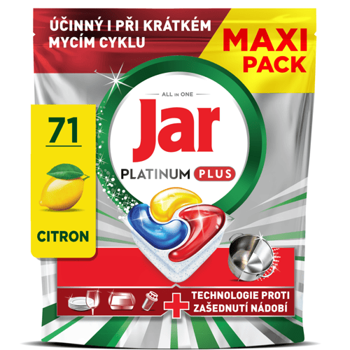 Jar Platinum Plus Lemon tablety do myčky jsou navrženy pro dosažení dokonale čistého nádobí i bez předmývání. Díky technologii Anti-Dull obnovují lesk nádobí a účinně odstraňují mastnotu i během krátkých mycích cyklů.