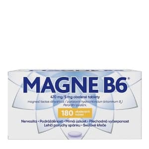 MAGNE B6 je léčivý přípravek, který obsahuje hořčík v kombinaci s vitaminem B6. Jde o látky nepostradatelné pro lidský organismus. Hořčík se v lidském těle nachází především uvnitř buňky, zpomaluje nervosvalový převod a snižuje nervovou dráždivost. Nedostatek hořčíku má vliv i na psychický stav: působí zvýšenou citlivost a podrážděnost nebo naopak únavu a ospalost. Vitamin B6 se účastní mnoha procesů látkové přeměny, mj. příznivě ovlivňuje vstup a setrvání hořčíku v buňce. Přípravek MAGNE B6 je určen k léčbě nedostatku hořčíku, ke kterému může dojít při různých situacích (například nedostatečný příjem hořčíku). Kombinace níže uvedených příznaků může signalizovat nedostatek hořčíku v organismu: Nervozita, podrážděnost, mírná úzkost, přechodná vyčerpanost, lehčí poruchy spánku. Známky úzkosti jako např. křeče trávicího traktu nebo bušení srdce (bez srdečních poruch). Svalové křeče, mravenčení. Doplňování hořčíku může tyto příznaky zlepšovat. Výhody výrobku: V kombinaci s vitamínem B6, který zvyšuje účinnost hořčíku díky jeho zvýšenému vstřebávání. Vhodné pro dospělé, dospívající a děti starší 6 let (s tělesnou hmotností od 20 kg). Balení obsahuje 180 tablet.