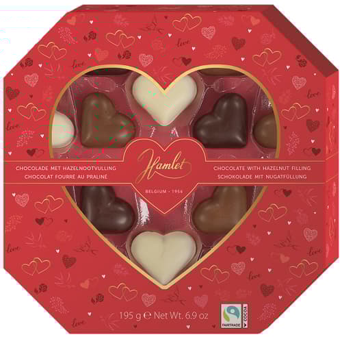 Srdíčka Hamlet Hearts jsou pralinky v hořké, mléčné a bílé čokoládě s jemnou lískooříškovou náplní.