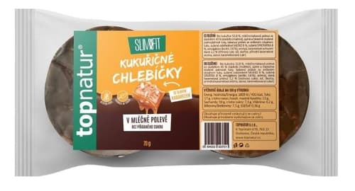 Kukuřičné chlebíčky Slim & Fit od Topnatur jsou křupavým snackem s jemnou mléčno-kakaovou polevou a slaným karamelem. Obsahují zdroj vlákniny, jsou přirozeně bez lepku a poleva neobsahuje přidaný cukr.