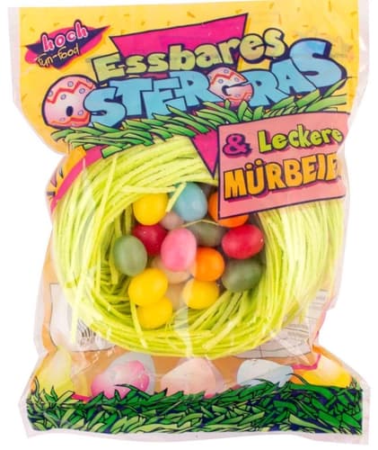 85 gCukrovinky ve tvaru velikonočních vajíček v trávě z jedlého papíru.