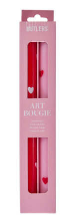 Sada svíček Art Bougie obsahuje dvě vzorované svíčky s barevnými srdíčky. Díky svému designu jsou ideální jako dekorace na slavnostní stůl nebo do kreativně laděného interiéru.