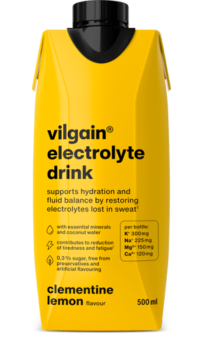 Nápoj Vilgain Electrolyte Drink s příchutí mandarinky a citronu. Obsahuje 4 druhy elektrolytů, vitaminy skupiny B a kokosovou vodu. Je slazen steviol-glykosidy ze stévie a neobsahuje rafinovaný cukr.