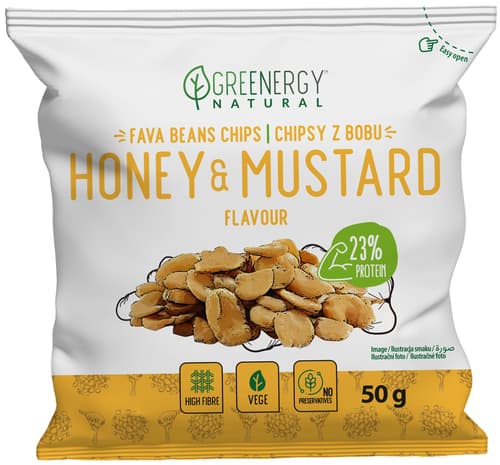 Luštěninové chipsy z křupavých fava bobů s výraznou příchutí medu a hořčice značky Greenergy se vyznačují vysokým podílem bílkovin a vlákniny, přičemž mají nízký obsah cukru. Chipsy jsou ideální volbou pro ty, kteří hledají zdravější alternativu k běžným snackům.