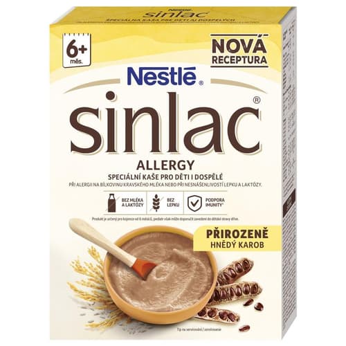 Nemléčná kaše Sinlac Allergy je speciální rýžová kaše s karobovou bílkovinou, která je vhodnou volbou pro děti i dospělé při nesnášenlivosti bílkovin kravského mléka, sóji a lepku. Vhodná od ukončeného 6. měsíce.