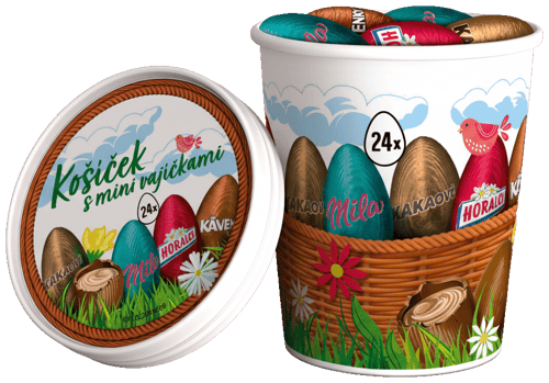 Balení obsahuje 24 čokoládových vajíček (značky Mila, Horalky, Kakaové a Kávenky). Každý druh je balen po šesti kusech a nabízí kombinaci mléčné čokolády a krémových náplní.