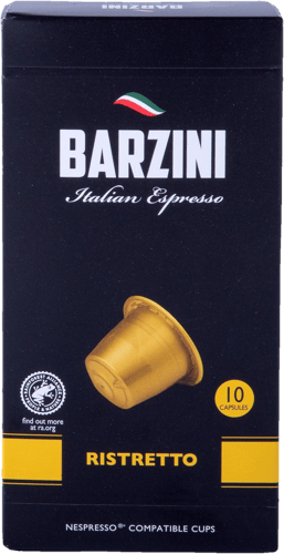 Barzini Ristretto jsou kapsle kompatibilní s kávovary Nespresso, které nabízejí intenzivní a výraznou chuť pro milovníky silné kávy. Směs robusty a arabiky z Asie, Střední a Jižní Ameriky vytváří tmavě praženou kávu s plným tělem a bohatou krémovou pěnou.