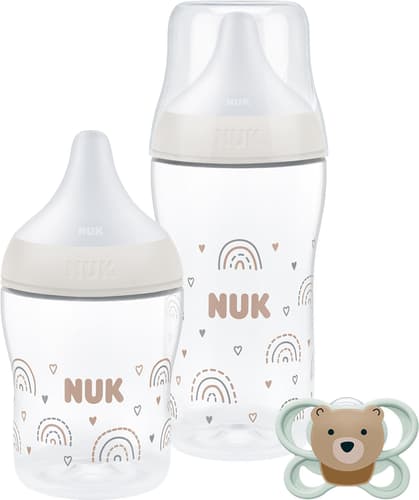 Nuk dárkový set Perfect Match Rainbow, vhodný pro děti od narození do tří měsíců, obsahuje dvě kojenecké láhve a silikonový dudlík. Láhve jsou vybaveny antikolikovým systémem a indikátorem teploty, který zajišťuje bezpečné krmení. Dudlík je navržen pro citlivou pokožku miminek.