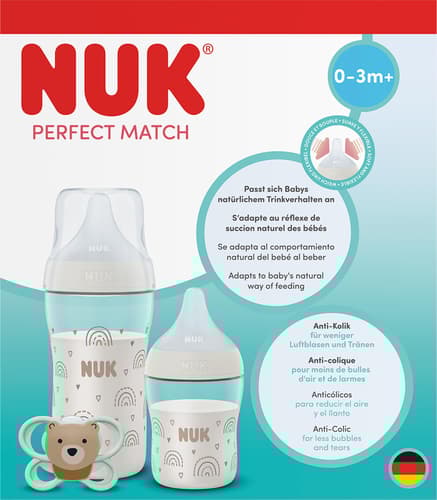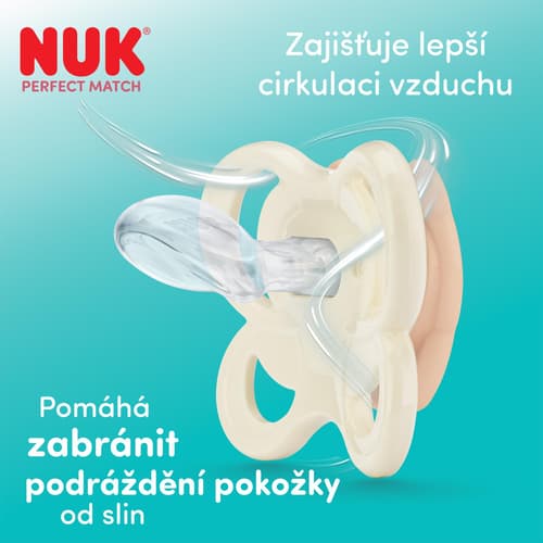 Láhve Nuk Perfect Match napodobují přirozený pocit kojení a podporují snadný přechod mezi kojením a krmením z lahve. Dudlík Nuk Perfect Match Air díky ventilačním otvorům minimalizuje vlhkost a chrání pokožku miminka.