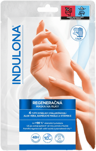 Indulona regenerační maska na ruce je jednorázová kosmetická maska ve tvaru rukavic, která poskytuje intenzivní hydrataci a regeneraci suché, namáhané nebo popraskané pokožky rukou. Díky svému složení pomáhá obnovit přirozenou jemnost a pružnost pokožky.