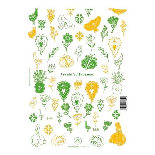 Česká republika,Samolepky Veselé Velikonoce od značky Be Nice přinášejí tradiční velikonoční motivy inspirované českou přírodou a tradicemi. Kombinace zelené a žluté barvy dodává dekoracím jedinečný vzhled.