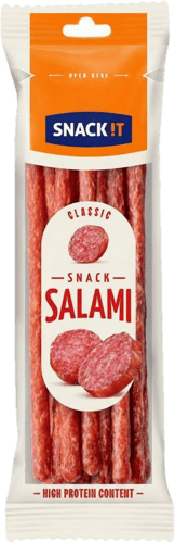 Snack!T Salami Classic je vepřový salámek s vysokým obsahu bílkovin. Je ideální volbou pro rychlou svačinu.