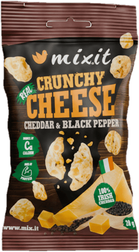 Křupavý snack z irského cheddaru s černým pepřem. Vyrobeno šetrným sušením pro zachování plné chuti sýru. Přirozeně bezlepkové a bez přidaných umělých látek.