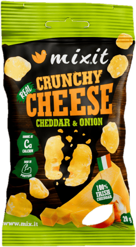 Křupavý sýr do kapsy – Irský cheddar & cibule je lahodný snack vyrobený ze 100% irského cheddaru a skutečné cibule. Díky speciálnímu sušení je extra křupavý a přirozeně bezlepkový.