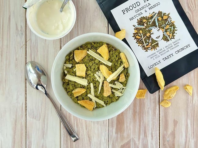 Tato Matcha a Mango granola je energizující variantou, se kterou bude každá snídaně rituál, který nevynecháte. Kromě povzbuzujících barev vás upoutá příjemná nasládlá vůně bílé čokolády, tropického manga a pečených BIO ovesných vloček zaprášených matchou.