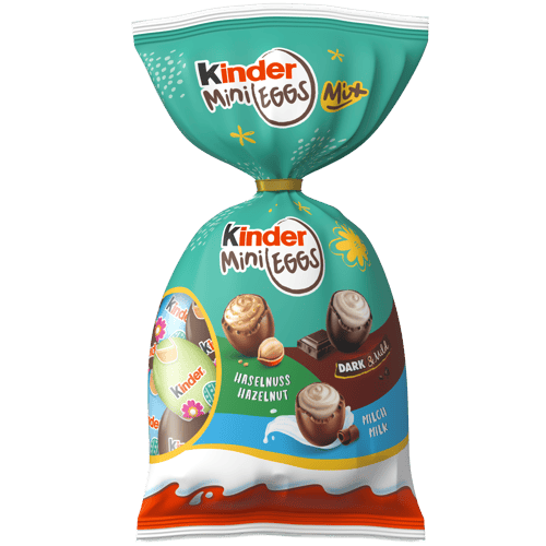 Kinder Mini Eggs Milk- Složení: jemná MLÉČNÁ čokoláda 45 % (cukr, sušené plnotučné MLÉKO (23 %), kakaové máslo, kakaová hmota, emulgátor: lecitiny (SÓJOVÉ); vanilin), cukr, sušené odstředěné MLÉKO (16,5 %), palmový olej, bezvodý MLÉČNÝ tuk, emulgátor: lecitiny (SÓJOVÉ); vanilin. Obsah mléčné sušiny: nejméně 32 % z celkové hmotnosti.Může obsahovat obiloviny obsahující LEPEK; VEJCE, MANDLE, LÍSKOVÉ OŘÍŠKY a PISTÁCIE.., Kinder Mini Eggs Dark Mild - máslo, sušené plnotučné MLÉKO (5 %), emulgátor: lecitiny (SÓJOVÉ); vanilin), cukr, sušené odstředěné MLÉKO (16,5 %), palmový olej, bezvodý MLÉČNÝ tuk, emulgátor: lecitiny (SÓJOVÉ); vanilin. Obsah mléčné sušiny: nejméně 24 % z celkové hmotnosti.,Může obsahovat obiloviny obsahující LEPEK; VEJCE, MANDLE, LÍSKOVÉ OŘECHY a PISTÁCIE. Kinder Mini Eggs Hazelnut - Složení: jemná MLÉČNÁ čokoláda 45 % (cukr, sušené plnotučné MLÉKO (23 %), kakaové máslo, kakaová hmota, emulgátor: lecitiny (SÓJOVÉ); vanilin), cukr, sušené odstředěné MLÉKO (14,5 %), palmový olej, LÍSKOVÉ OŘECHY (6,5 %), bezvodý MLÉČNÝ tuk, emulgátor: lecitiny (SÓJOVÉ); vanilin. Obsah mléčné sušiny: nejméně 29,5 % z celkové hmotnosti.