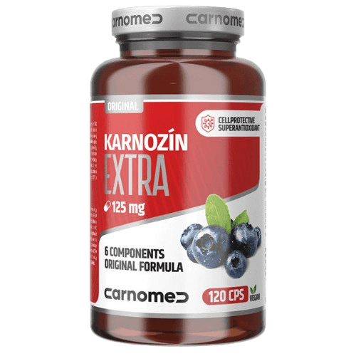 Doplněk stravy. Carnomed Karnozín Extra je doplněk stravy ve formě kapslí, který obsahuje kombinaci látek L-karnosin, L-karnitin, koenzym Q10, vitamín E, extrakt z borůvek a extrakt z plodů révy vinné. L-karnosin je 100% přírodní dipeptid složený ze dvou aminokyselin, beta-alaninu a histidinu, které se přirozeně vyskytují v různých tkáních lidského těla. L-karnitin je rovněž 100% přírodní látka a hraje důležitou roli v energetickém metabolismu. Koenzym Q10 se přirozeně nachází v lidských buňkách, zejména v tkáních s vysokými energetickými nároky, jako jsou srdce, játra, ledviny, plíce a svaly. Vitamín E přispívá k ochraně buněk před oxidativním stresem. Extrakt z borůvek podporuje zdravý stav zraku, normální činnost cévní soustavy a působí jako antioxidant, přičemž zajišťuje až o 34,5 % vyšší antioxidační kapacitu. Antioxidační účinky má také extrakt z plodů révy vinné. Přípravek obsahuje vysokou dávku L-karnosinu, je vhodný pro vegany i vegetariány a je určen pro dospělé a děti od 3 let. Nepřekračujte doporučené denní dávkování. Uchovávejte mimo dosah dětí. Doplňky stravy nejsou náhradou pestré a vyvážené stravy. Balení obsahuje 120 kapslí. Hmotnost obsahu: 37,7 g.