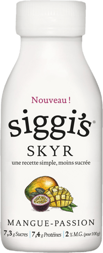Zakysaný mléčný nápoj Siggi's Skyr Drink Mango & Marakuja je ochucený nápoj s vysokým obsahem bílkovin a nízkým obsahem laktózy. Obsah laktózy je méně než 0,1 g na 100 ml.