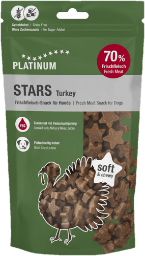 Platinum Stars Turkey je poloměkký pamlsek pro psy vyrobený z 70 % čerstvého krůtího masa. Díky unikátní metodě přípravy Fleischsaftgarung si zachovává šťavnatost, plnou chuť a vůni. Ideální pro výcvik nebo jako odměna. Kousky ve tvaru hvězdiček jsou snadno stravitelné a vhodné i pro psy s nižší aktivitou nebo nadváhou. Obsahují bylinky, jako je oregano, ostropestřec a heřmánek, které podporují zdravé trávení. Bez obilovin a přidaného cukru.
