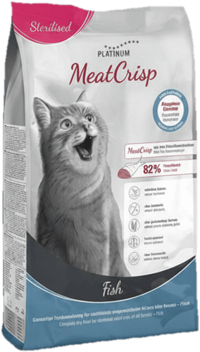 Platinum MeatCrisp Sterilised Fish je kompletní krmivo pro kastrované kočky, vyrobené z 82 % čerstvého masa. Díky unikátní metodě Freshmeatdryer si zachovává přírodní mikroživiny a aminokyseliny, což zajišťuje vysokou kvalitu a přirozenou chuť.