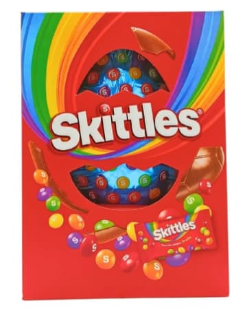 Velikonoční balení obsahuje duté mléčné čokoládové vejce a balíček žvýkacích bonbonů Skittles s ovocnými příchutěmi. Ideální jako sladká velikonoční nadílka pro milovníky kombinace čokolády a ovocných bonbonů.