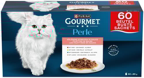 Dopřejte své dospělé kočce lahodné kapsičky Purina Gourmet Perle z Maďarska. Toto kompletní krmivo nabízí čtyři neodolatelné příchutě – hovězí, kuřecí, králičí a losos – všechny v bohaté omáčce. Praktické balení obsahuje 60 sáčků po 85g, celkem 5,1 kg, což zajistí, že váš mazlíček bude mít vždy po ruce chutnou a vyváženou stravu.